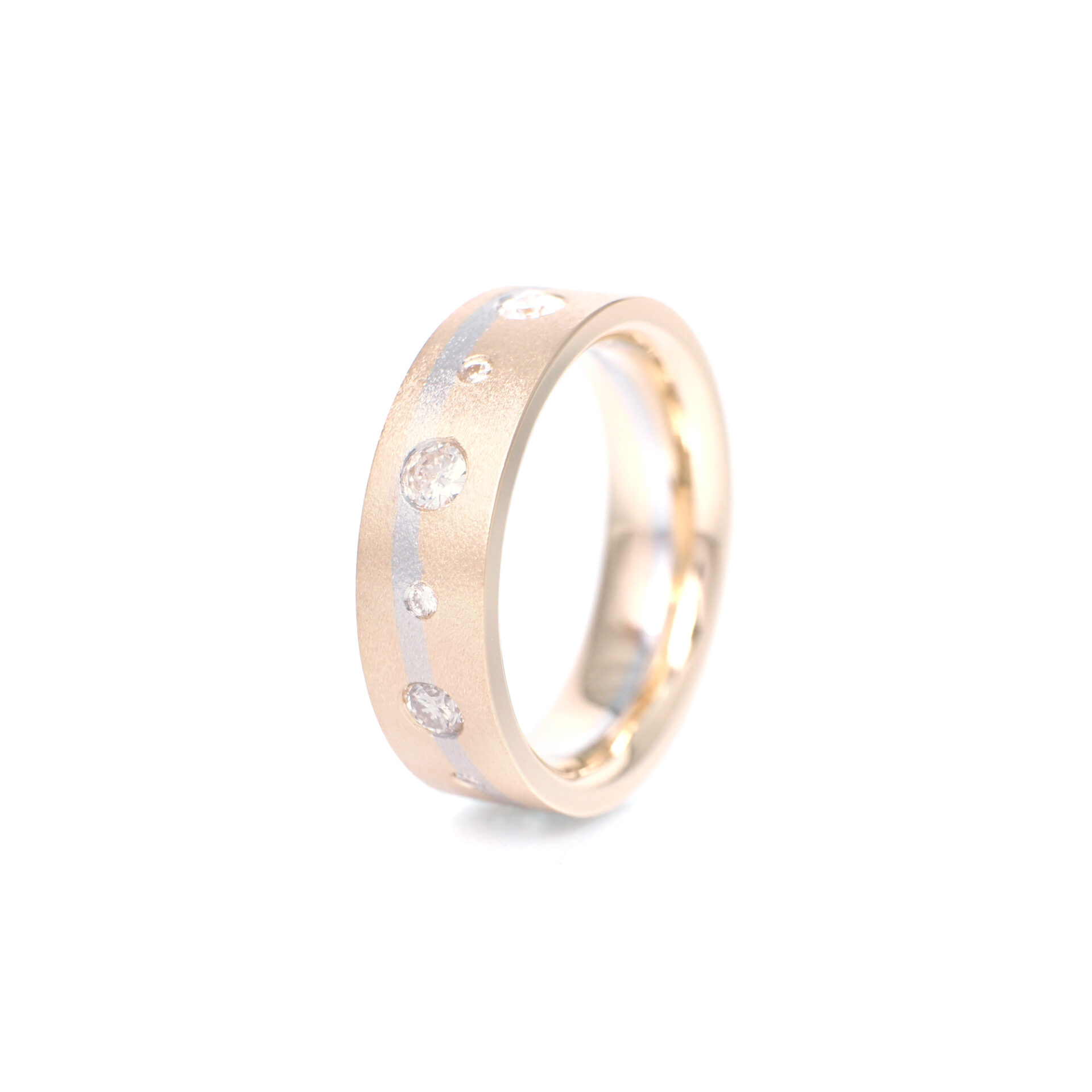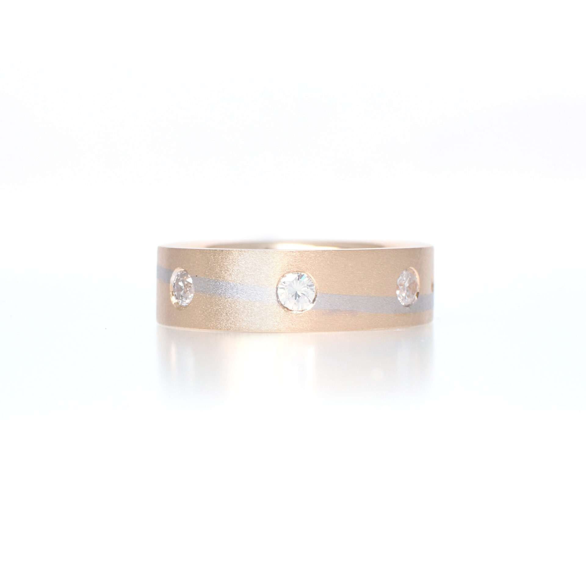 The overall form of the ring is a wide flat band ring of gold with a diagonal band of platinum connecting the diamonds in between.